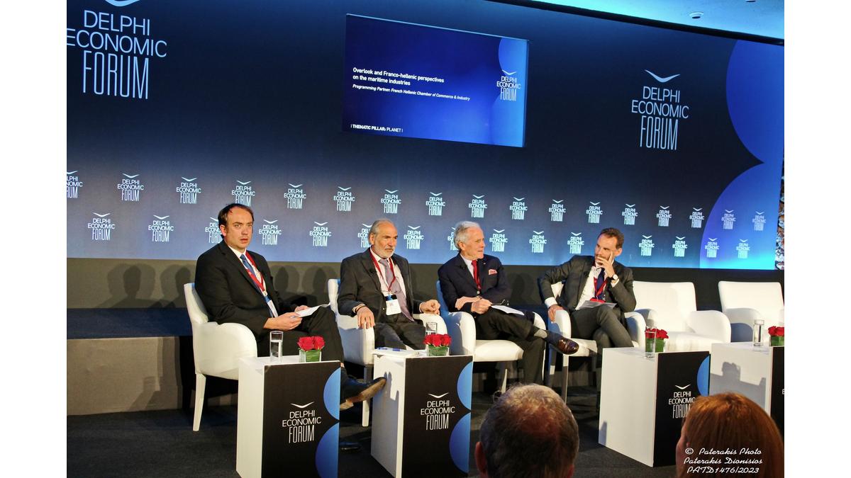 Le Comité Maritime de la CCI FG était présent au Delphi Economic Forum 2023 avec un panel composé de Messieurs Philippe Louis-Dreyfus, Chairman de Louis-Dreyfus Armateurs, John C. Lyras, Président de Paralos Maritime Corporation, Cyrille Bret, Directeur Pays de Naval Group et Thibaud de Saint-Lager, membre de la CCI, modérateur des débats .