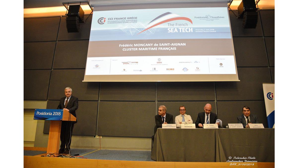 Το Ελληνογαλλικό Εμπορικό και Βιομηχανικό Επιμελητήριο με την ευκαιρία της έκθεσης Posidonia διοργάνωσε την Πέμπτη 7 Ιουνίου 2018 ημερίδα με θέμα «The French Sea Tech». Η εκδήλωση ήταν υπό την αιγίδα της γαλλικής ένωσης CLUSTER MARITIME FRANҀAIS, της οποίας ο πρόεδρος κύριος Moncany de Saint-Aignan έδωσε το παρόν, κάνοντας ομιλία με θέμα «Blue is the new Green». Στην εκδήλωση παρευρέθηκαν η Α.Ε Πρέσβης της Γαλλίας στην Ελλάδα, κύριος Christophe Chantepy και σημαντικές προσωπικότητες από τον επιχειρηματικό και ναυτιλιακό κόσμο της Ελλάδας και της Γαλλίας.