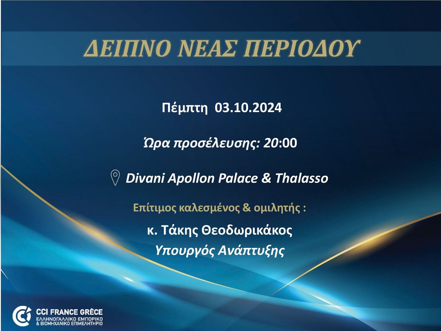 Είμαστε στην ευχάριστη θέση να σας ενημερώσουμε ότι ότι το Ελληνογαλλικό Εμπορικό και Βιομηχανικό Επιμελητήριο διοργανώνει δείπνο την Πέμπτη, 3 Οκτωμβρίου 2024, στις 20:00, στην Αθήνα με επίτιμο καλεσμένο και ομιλητή της βραδιάς τον Υπουργό Ανάπτυξης, κ. Τάκη Θεοδωρικάκο.