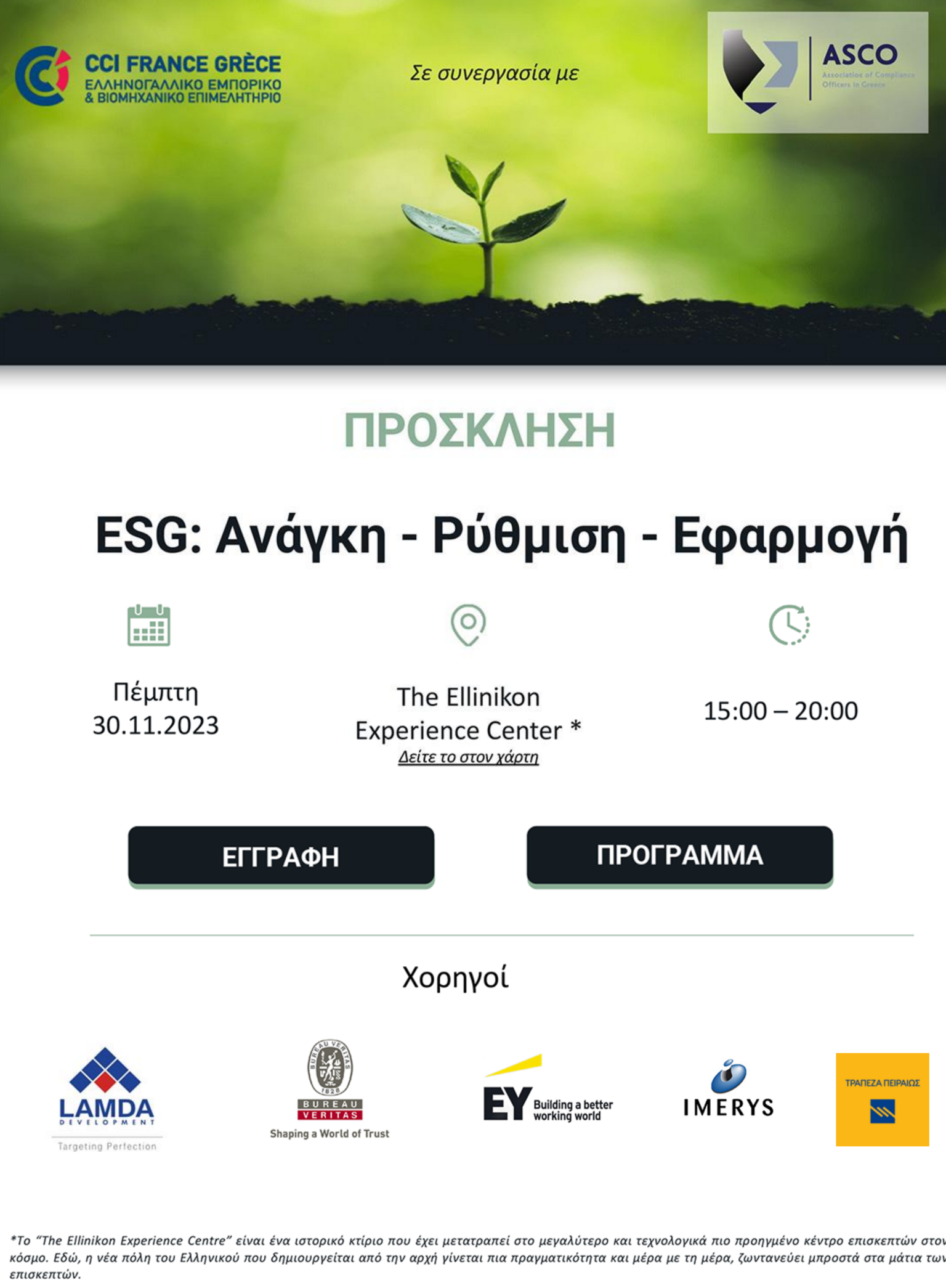 Το Ελληνογαλλικό Εμπορικό & Βιομηχανικό Επιμελητήριο διοργανώνει Ημερίδα σε συνεργασία με τον ΣΕΚΑΣΕ, (Σύνδεσμος Επαγγελματιών Κανονιστικής Συμμόρφωσης Ελλάδος), την Πέμπτη 30 Νοεμβρίου 2023, στις 14.30 στο The Ellinikon Experience Centre με θέμα :