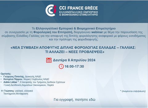 Το Ελληνογαλλικό Εµπορικό & Βιοµηχανικό Επιµελητήριο σε συνεργασία µε τη Φορολογικήτου Επιτροπή, διοργανώνει webinar με θέμα την παρουσίαση της σύμβασης Ελλάδας-Γαλλίας για την αποφυγή της διπλής φορολόγησης αναφορικά με φόρους εισοδήματος και την πρόληψη της φοροδιαφυγής.