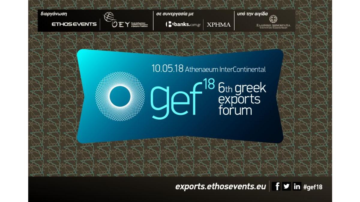 Μετά από μία ακόμη χρονιά -ρεκόρ για τις εξαγωγικές επιδόσεις της χώρας, οι οποίες στηρίζουν έμπρακτα την εθνική οικονομία και την προσπάθεια της χώρας για επιστροφή σε βιώσιμη πορεία ανάπτυξης, διοργανώνεται την Πέμπτη 10 Μαΐου 2018, στο ξενοδοχείο AthenaeumIntercontinental, το 6thGreekExportsForum (#gef18 - http://www.exports.ethosevents.eu) .