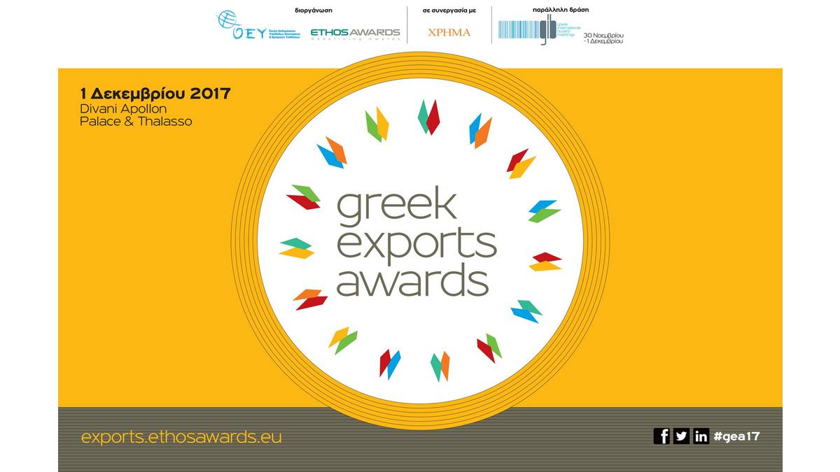 Για 6η συνεχή χρονιά, η Ένωση Διπλωματικών Υπαλλήλων Οικονομικών & Εμπορικών Υποθέσεων (ΕΝΔΥ ΟΕΥ) του Υπουργείου Εξωτερικών σε συνεργασία με την EthosAwards και το οικονομικό και επενδυτικό περιοδικό ΧΡΗΜΑ διοργανώνουν τα εξαγωγικά βραβεία Greek Exports Awards 2017, υπό την αιγίδα του Ελληνογαλλικού Επιμελητηρίου , τη 1 Δεκεμβρίου 2017, προκειμένου να αναδείξουν και να επιβραβεύσουν τους ανθρώπους, τις ιδέες και τις συνεργασίες μεταξύ των κορυφαίων εξαγωγικών επιχειρήσεων της χώρας.