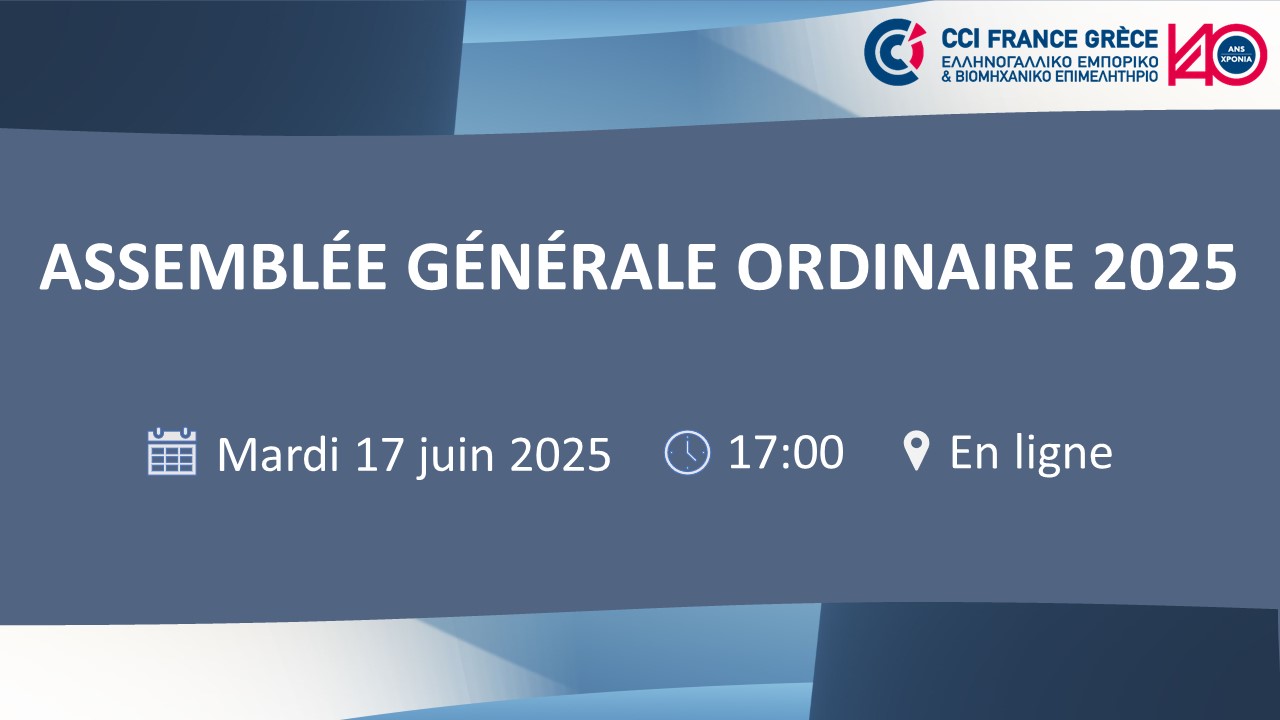 L’Assemblée Générale Ordinaire 2025 de la Chambre de Commerce et d' Industrie France-Grèce se tiendra le mardi 17 juin 2025 à 17h00, sous forme de visioconférence exclusivement, via la plateforme Teams, en application de l’article 14 des statuts de la Chambre et de la législation relative à ces dispositions (loi 4712/2020 article 23§8).