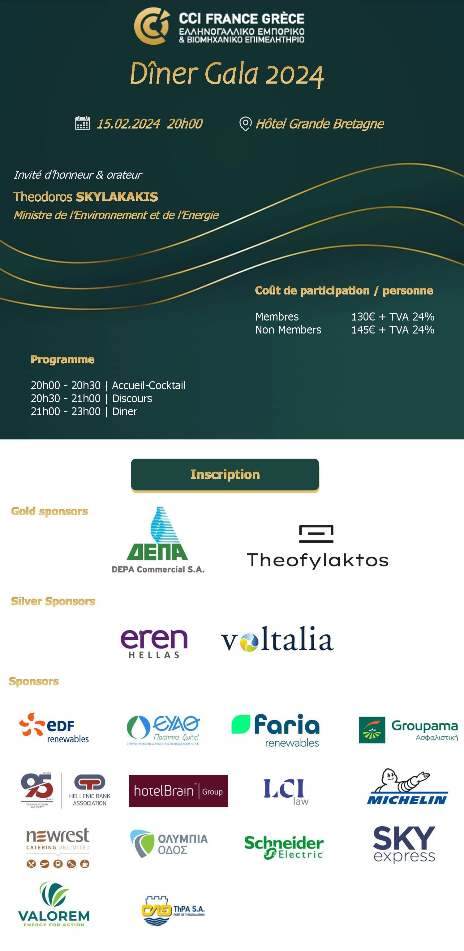 La Chambre de Commerce et d’Industrie France Grèce, a le plaisir de vous annoncer que son dîner annuel - gala aura lieu le jeudi 15 février, à l' hôtel Grande Bretagne avec comme invité d’honneur et orateur le ministre de l’Environnement et de l’Energie, M.Theodoros Skylakakis.