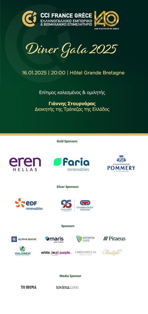 Nous avons le plaisir de vous annoncer que le dîner-Gala de la Chambre de Commerce et d’Industrie France Grèce se tiendra le jeudi 16 janvier 2025 à l’hôtel Grande Bretagne, avec comme invité d’honneur et orateur le Gouverneur de la Banque de Grèce, Monsieur Yannis STOURNARAS.
