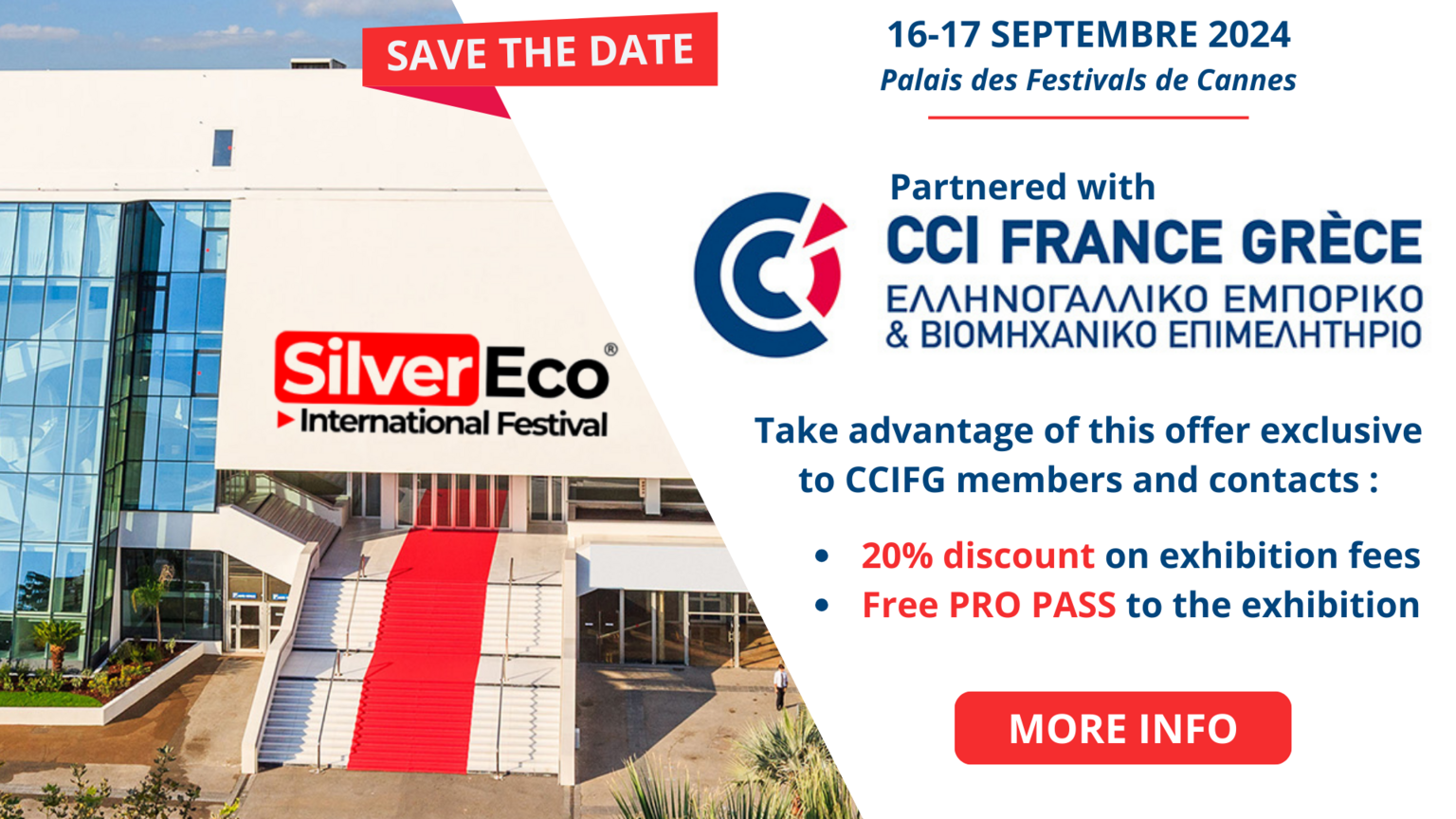 La CCI France Grèce, partenaire de l’édition 2024 du Silver Eco International Festival SilverEco.org, est heureuse de vous proposer gratuitement le Pass d’Accès B2B ainsi que 20% de réduction sur les coûts d’exposition.