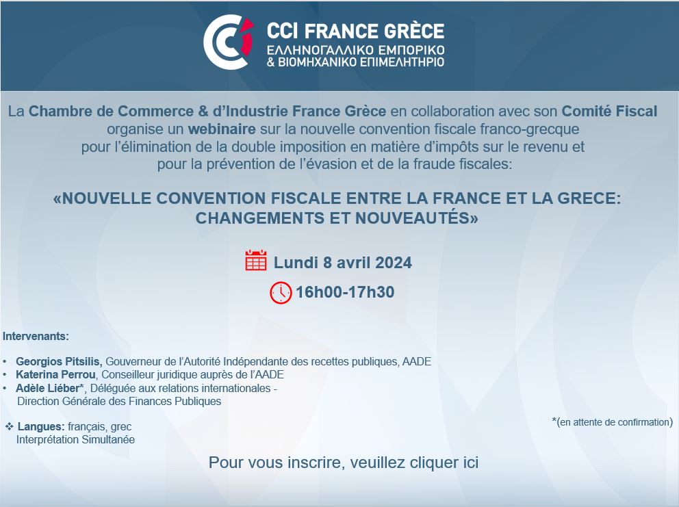 La Chambre de Commerce & d’Industrie France Grèce en collaboration avec son Comité Fiscal organise un webinaire sur la nouvelle convention fiscale franco-grecque pour l’élimination de la double imposition en matière d’impôts sur le revenu et pour la prévention de l’évasion et de la fraude fiscales.